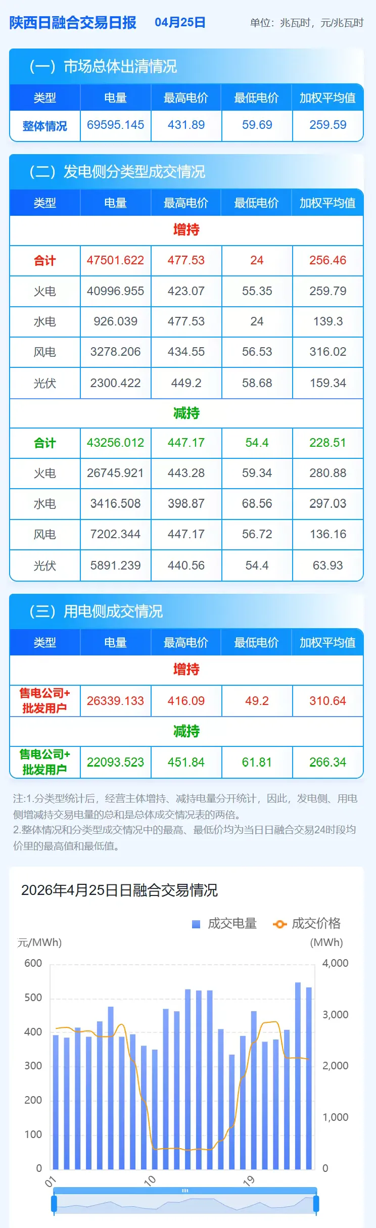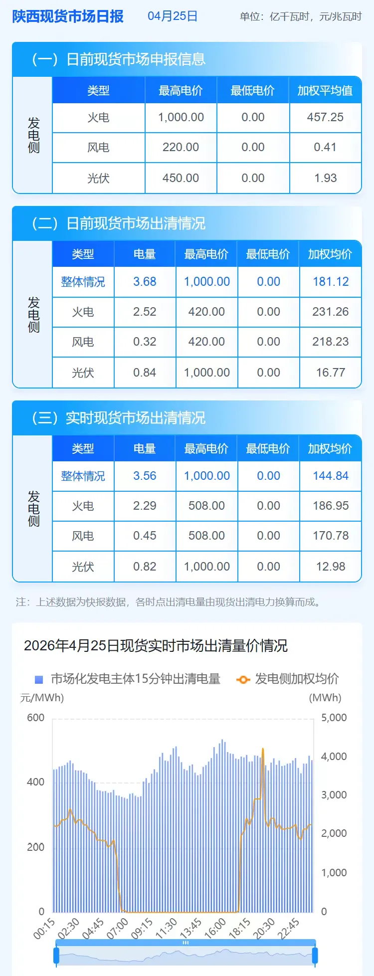 信息披露-陕西现货市场及中长期日融合运行日报(2026年4月25日)