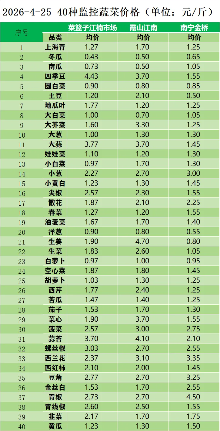 2026年4月25日海口市菜篮子江楠市场主要蔬菜价格
