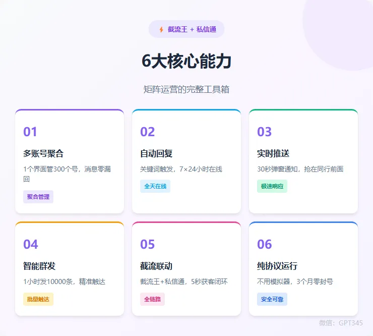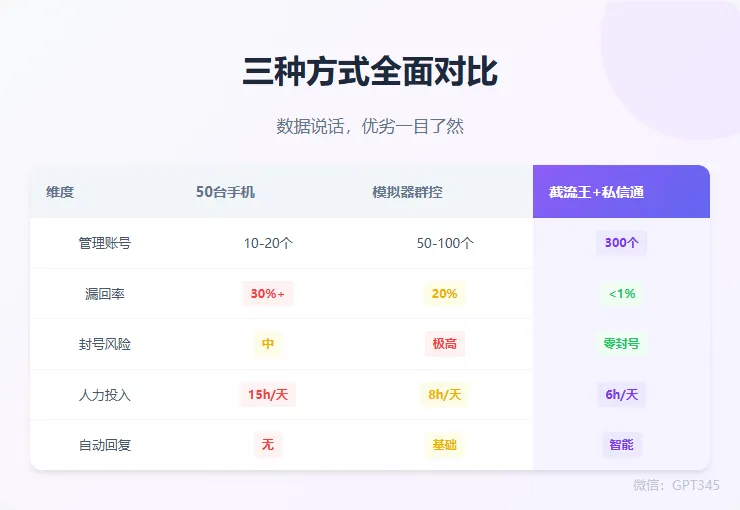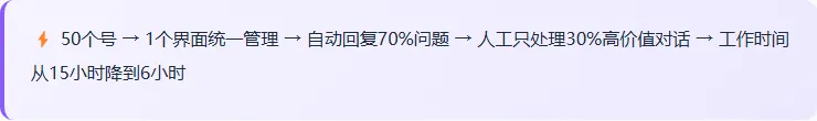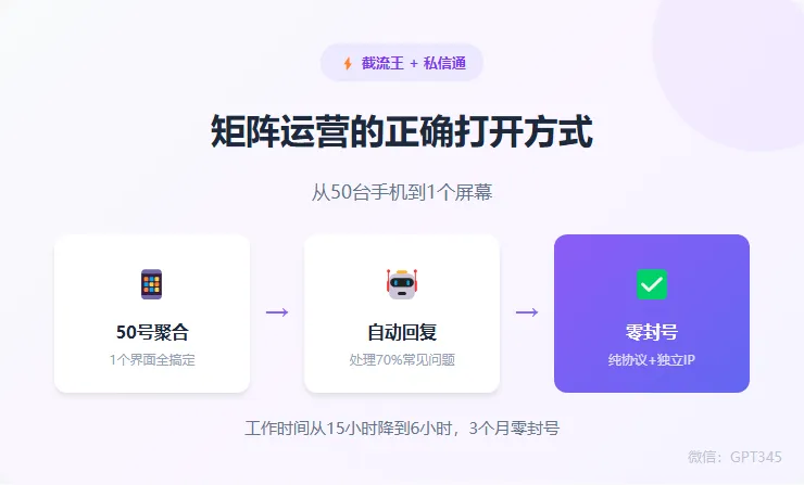 老刘现在每天的工作就是:早上看一眼数据面板,处理几条高价值对话,检查截流王的线索质量,然后就可以去跑客户了。50个号,1个人,6小时,零封号。