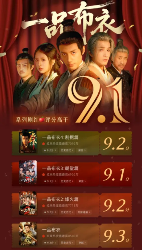 系列化是壁垒。短剧行业正从”单部爆款”转向”长期IP运营”。《行道者》通过角色联动、世界观共享构建IP宇宙,《一品布衣》第二部预约量已超100万。系列化不仅能降低获客成本,还能通过粉丝沉淀提高分账天花板。