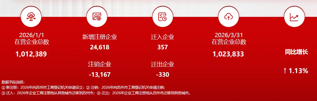 2026年一季度苏州在营企业稳定增长,截至 3月31日,苏州市注册在营企业总数 1,023,833家,同比增长1.13%,增速较去年同期有所增加。但从企业迁址来看,外市迁入苏州的企业数量同比下降13.3%,且仅比迁出企业数量多27家。