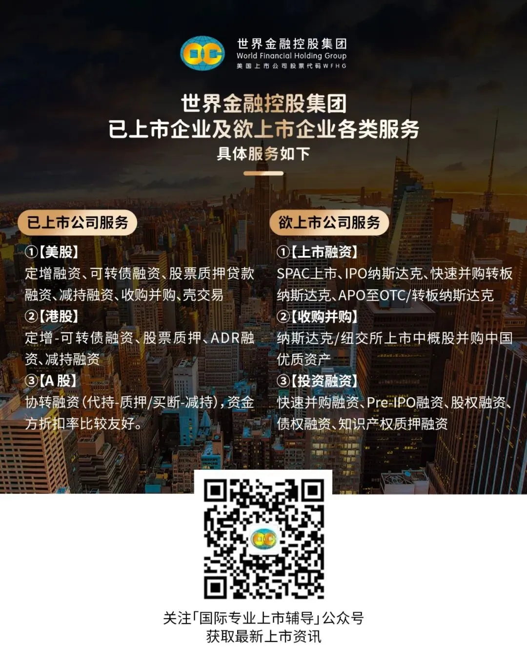 世界金融控股集团(以下简称“世界金控”)凭借多年跨境资本运作经验,为企业提供“上市前-上市中-上市后”全周期服务,覆盖上市前融资、赴美上市IPO、融资型反向并购APO及已上市企业再融资等环节,助力企业规避风险、实现高质量发展。