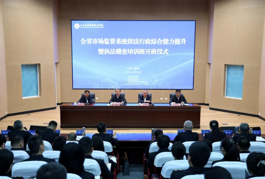 为深入落实中央巡视反馈意见整改、群众身边不正之风和腐败问题集中整治、执法队伍“清风铁纪”教育整顿专项行动工作要求,全面提升全省市场监管执法稽查队伍综合能力与规范化水平,4月20日至24日,2026年全省市场监管执法稽查培训班(第一期)在山东药品食品职业学院威海校区顺利举办。省局副局长李冠博、学院党委书记李忠祥、省局法规处处长王来智、省局稽查局局长韩江峰出席开班仪式,全省各市市场监管综合执法骨干、部分区县局执法人员及省局稽查局相关同志共120余人参训。