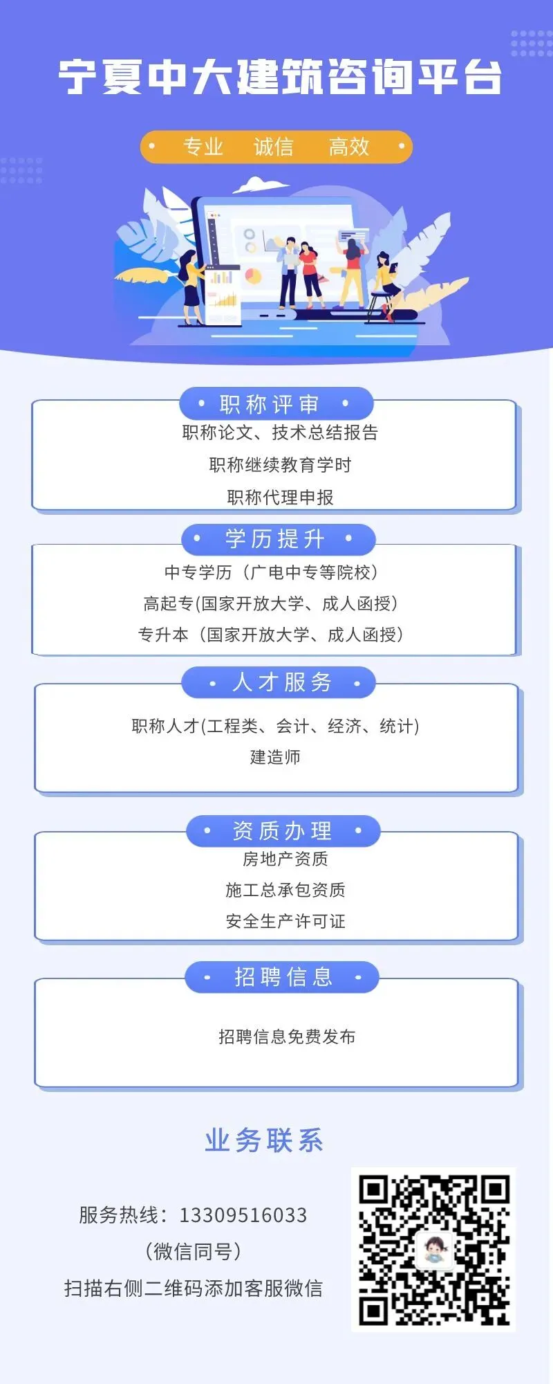 若需要咨询宁夏本地初级、中级、高级职称申报、技术总结报告、论文、职称学时等职称相关问题,直接扫描下方二维码或拨打电话联系详询。