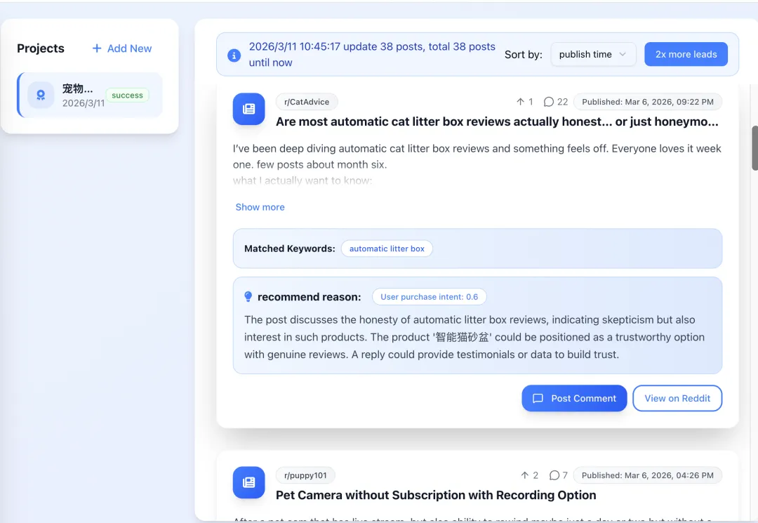 此外,Leadmore AI 还能推送潜在用户线索。品牌不需要完全靠人工每天刷帖、翻评论,而是可以更及时地发现相关需求。对 Reddit 营销来说,这一步非常重要,因为真正的机会往往不是等用户看到你,而是你能不能在用户表达需求时及时出现。