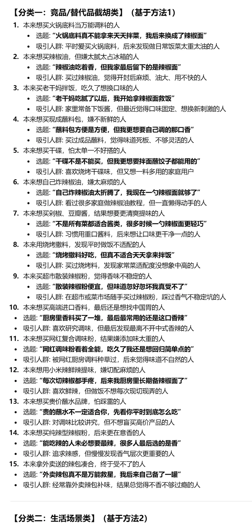 当时在讲这个大小人群分析的时候还顺便提到了截胡的思维,也就是我们可以把本来想买这个产品的人群通过某些内容截流到,就可以有很多截流的选题了。