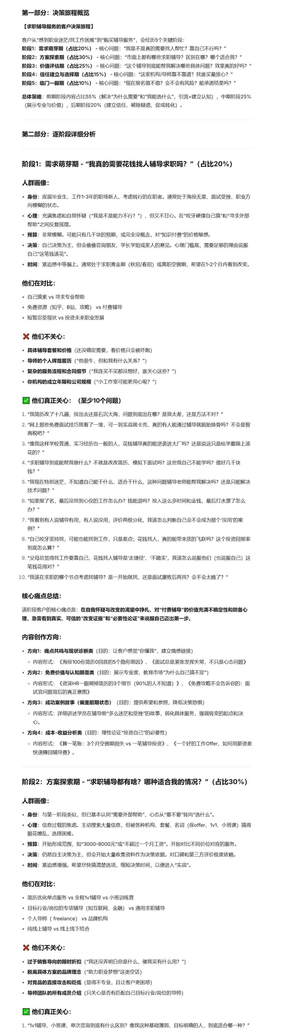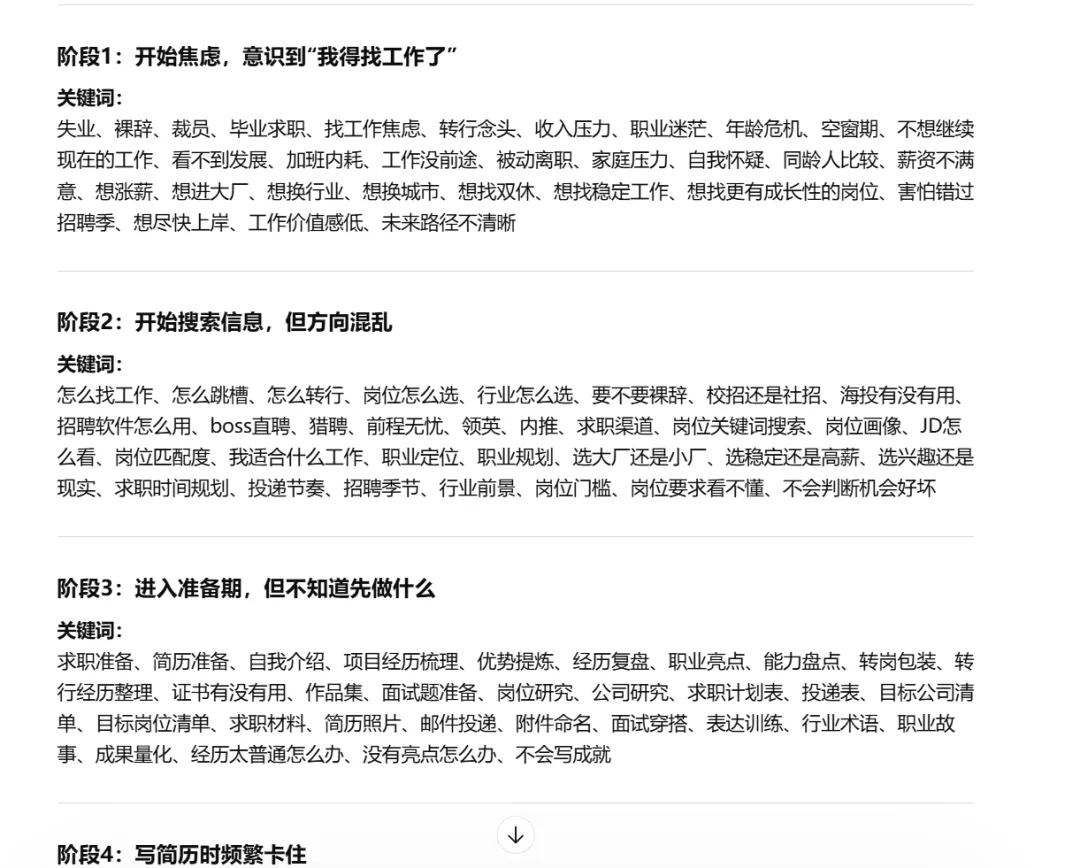 这里就不拿辣椒面这种低客单产品做例子了,比如求职辅导这个项目,最终需要求职辅导的客户都有下面这5个阶段,我们针对每个阶段的人群布局好对应的内容就行。