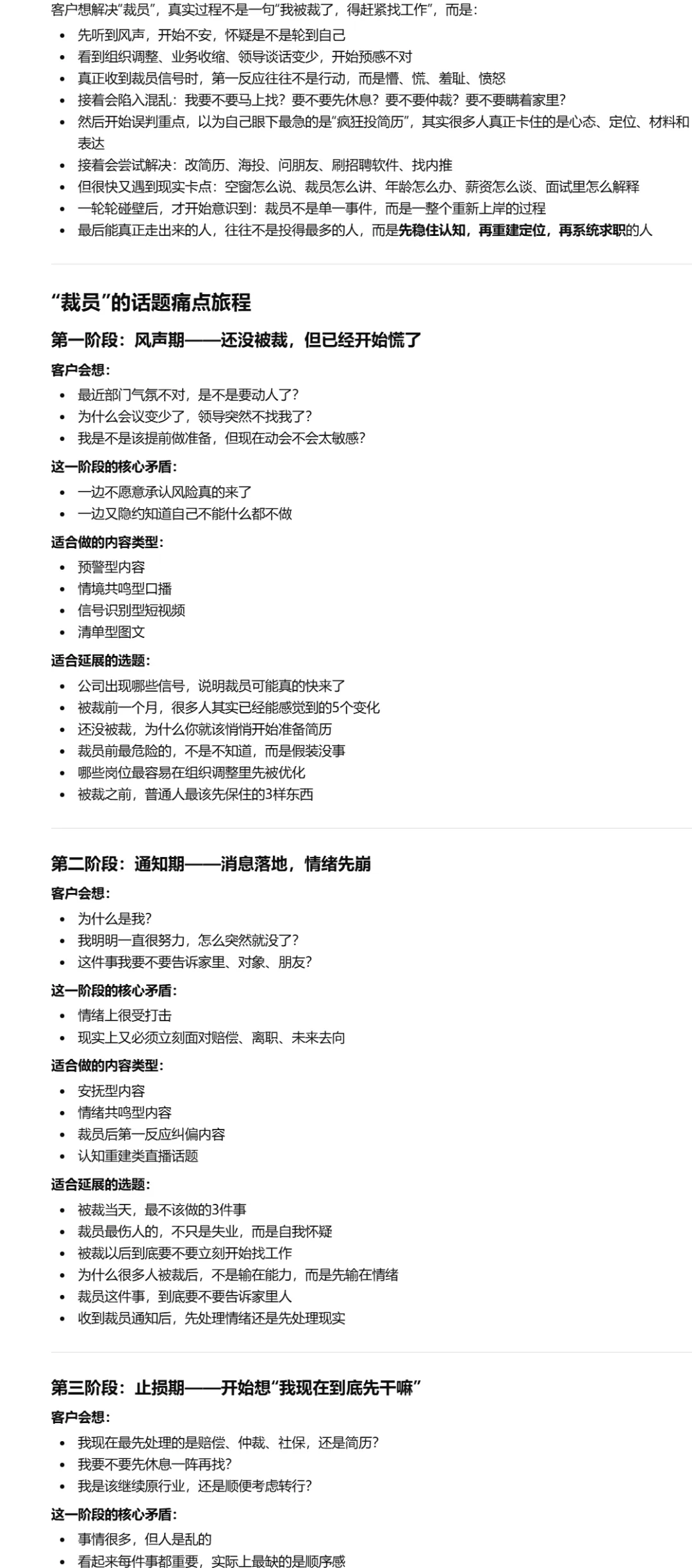 比如裁员这个话题,再继续根据这个话题做阶段分析,这样我们就能够不放过客户每个阶段遇到的问题了。