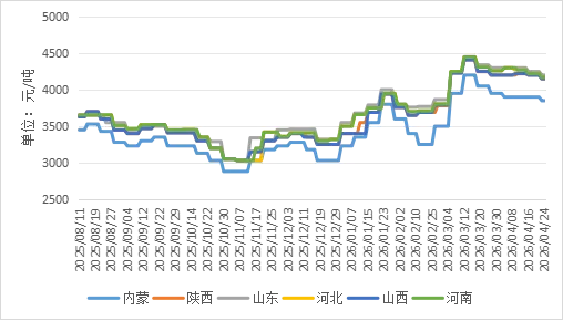 分区域来看,西北、华东、华北、华中主流地区下调50元/吨,东北辽吉下调100元/吨,为周内跌幅最大区域;新疆因市场封闭、外销受限,价格稳定在3500元/吨。截至4月25日,陕西、山西、山东、河北、河南等主产区价格集中在4150-4200元/吨,东北低位3420-3500元/吨,西北内蒙3850元/吨,区域价差保持合理区间,跨区流通竞争加剧但未出现大幅套利空间。整体而言,本周价格下行并非恐慌性抛售,而是供需错配下的理性回归,下游承接能力不足与上游出货压力共同主导,市场进入弱势整理通道。#化盟商机#化盟助手#危好运#化工圈子#化盟网