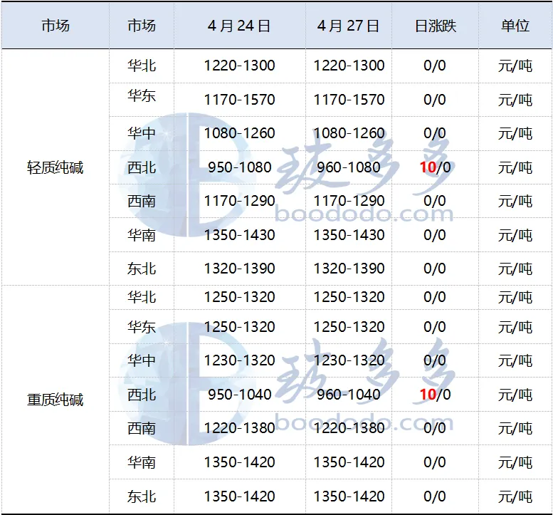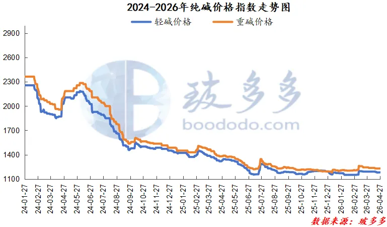 据玻多多数据测算:4月27日轻质纯碱价格指数为1181.43,较上一工作日上涨1.43,幅度为0.12%;重质纯碱价格指数为1230,较上一工作日上涨1.43,幅度为0.12%。