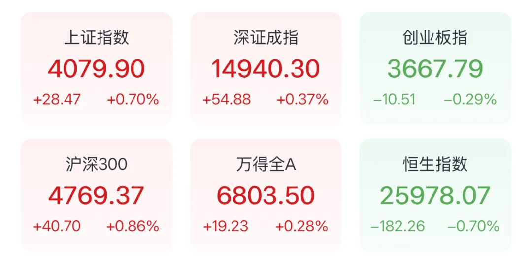 上周,市场主要指数多数上涨。其中上证指数报4079.90点,上涨+0.70%,沪深300上涨+0.86%。港股方面,恒生指数下跌-0.70%。