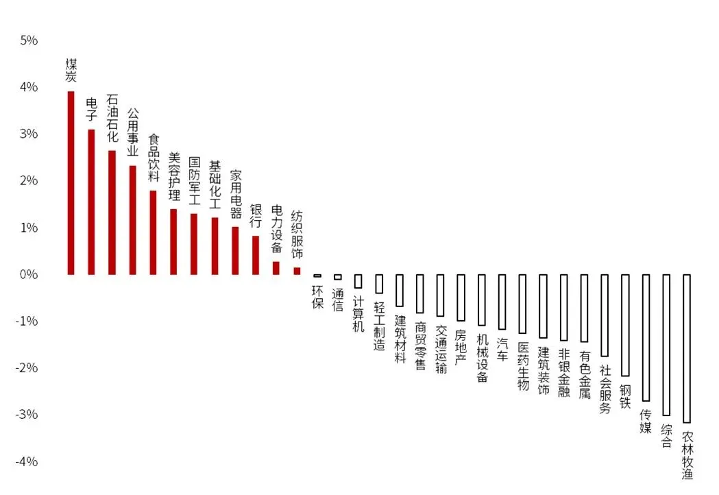 上周,31个申万一级行业板块中,12个行业板块上涨,排名前三的领涨板块分别为煤炭(+3.93%)、电子(+3.11%)、石油石化(+2.66%);排名后3位的行业板块分别为农林牧渔(-3.15%)、综合(-3.00%)、传媒(-2.69%)。