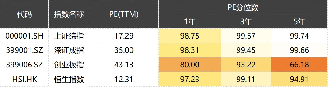 截至4月17日,国内主要市场股指估值较前值多数上涨,上证综指/深证成指/创业板指/恒生指数的市盈率分别为17.29/35.00/43.13/12.31倍,分别处于三年的99.57/99.45/93.22/99.11分位,上周末收盘日估值分别17.15/34.96/42.53/12.37倍。