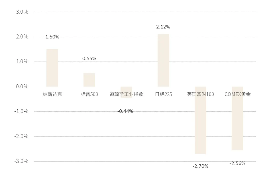 上周,海外主要市场呈分化走势,其中美股三大指数纳指、标普500指数分别上涨+1.50%、+0.55%、道琼斯工业指数下跌-0.44%,日经225指数上涨+2.12%。
