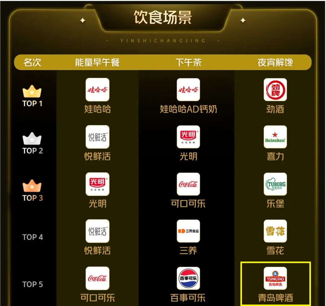 关于这一点,拿下夜宵解馋场景市场占有率增长排行榜 TOP5 的青岛啤酒很值得拿来说说。