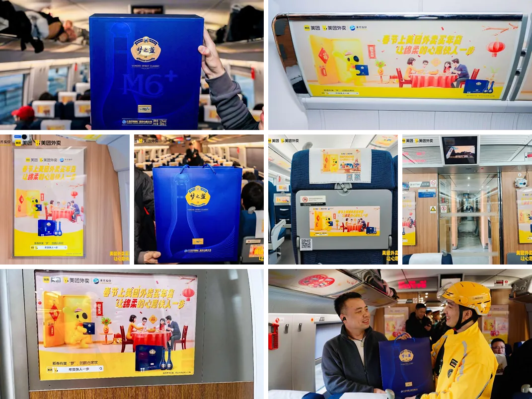 接着在触达层面,品牌抓住春节这一节点进行了全域布局。线下,高铁站、机场、外卖小哥都成为品牌触点,线上推出互动 H5,模拟忘带年货、临时送礼等痛点场景,一键跳转美团闪购下单。在一系列举措下,梦之蓝销售占比提升超 20%。