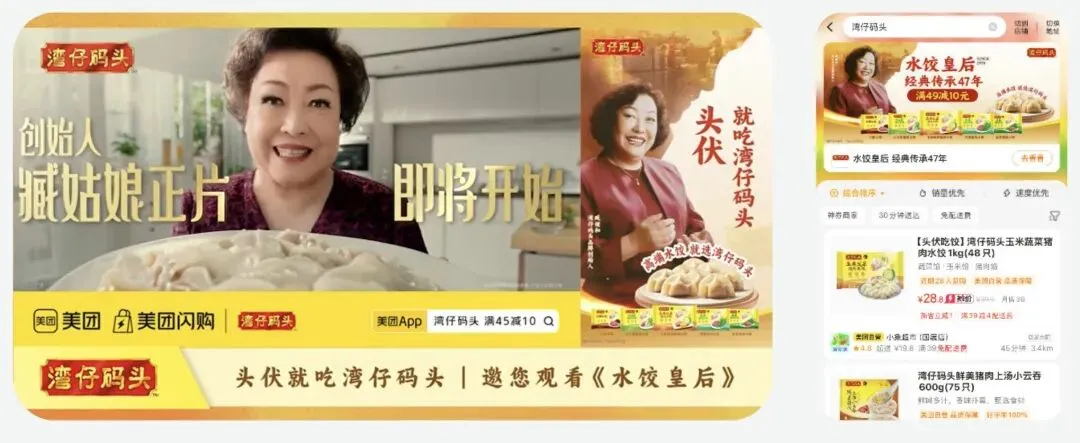 湾仔码头就借力 IP 打通了“即看即买”的闭环,品牌与腾讯视频、美团闪购三方联动,借势大电影《水饺皇后》的 IP 热度。用户在腾讯视频看到电影中的水饺场景,点击跳转下单,最快 30 分钟就能吃到同款水饺。