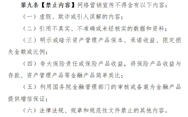 除规范网络营销内容外,《办法》第三章专门针对金融产品网络营销行为作出系统性规范,共计九条细则。