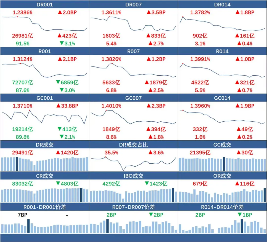 今日资金面均衡,资金价格上行。今日成交88003亿元。DR001加权1.24%,较前日上行2BP,DR007加权1.36%,较前日上行4BP。