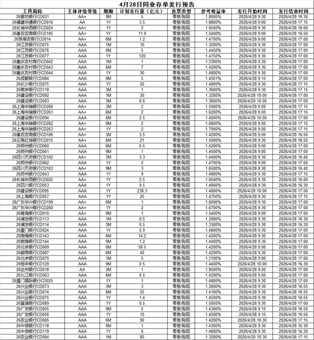 (三)同业存单发行预告