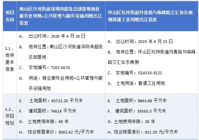 2026年4月20日到4月26日,新增土地招拍挂项目2个,分别位于南山区、坪山区,土地用途分别为商业服务业用地+公共管理与服务设施用地、普通工业用地。