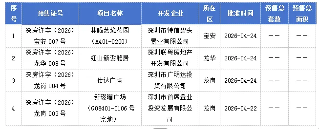 2026年4月20日到4月26日,新增预售项目为4个,分别位于深圳市宝安区、龙华区、龙岗区,均未公示预售套数及面积。