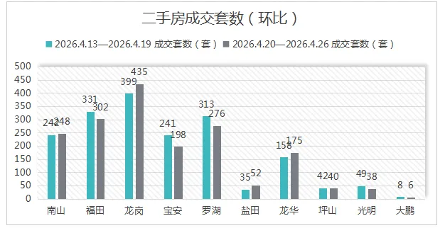 本周(4.20-4.26)深圳全市二手住宅共成交1,770套,成交面积185,474平方米,环比微降2.64%,整体保持平稳运行。各区域成交表现如下: