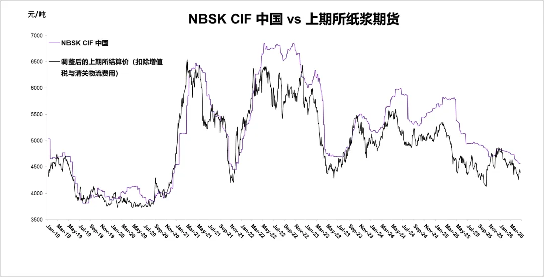 自4 月 17 日上期所成交最活跃的 BSK 期货合约由 5 月合约切换至 9 月合约后,期货价格一度上行走强,当周后期有所回落。4 月 24 日上周五,9 月合约收盘报 5084 元 / 吨,较上周每吨上涨 16 元。扣除 13% 增值税及 120 元 / 吨物流费用后,折合美元成本为每吨 644 美元。