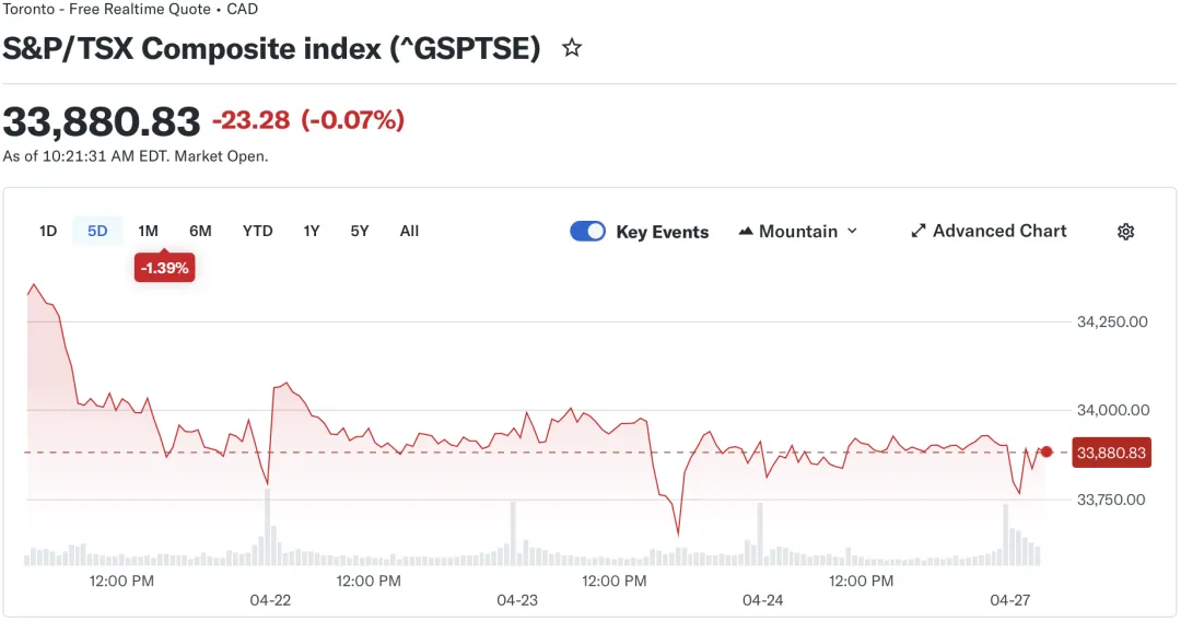 上周S&P/TSX Composite Index基本维持在约33,700–34,200区间震荡,周内小幅回落约1%左右;能源板块受油价维持在95–100美元区间支撑,但在利率不确定性与全球风险偏好回落影响下,整体市场表现为高位震荡且动能减弱。