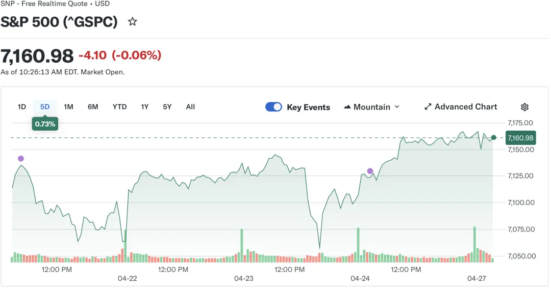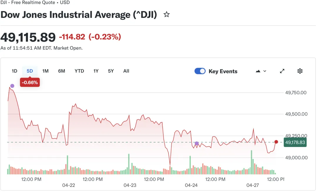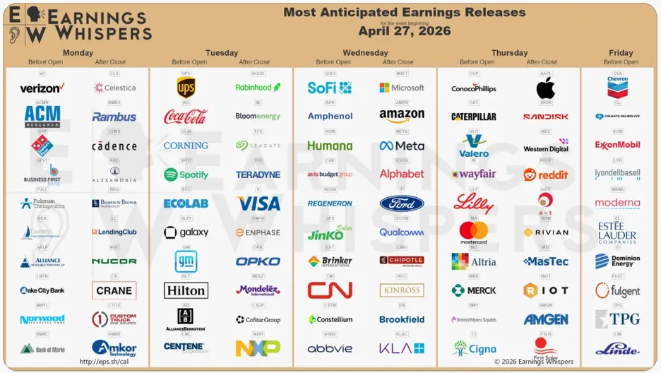 从科技板块来看,市场在4月29日(周三)至4月30日(周四)进入关键盈利验证窗口,Microsoft、Alphabet、Meta以及Apple等龙头公司集中发布财报。当前科技股已累计较大涨幅,市场定价更多基于盈利预期,因此短期走势将高度依赖财报与指引。一旦收入增长或利润率不及预期,股价可能快速回调;反之,若云业务与新技术相关收入继续超预期,则有望支撑板块维持强势。