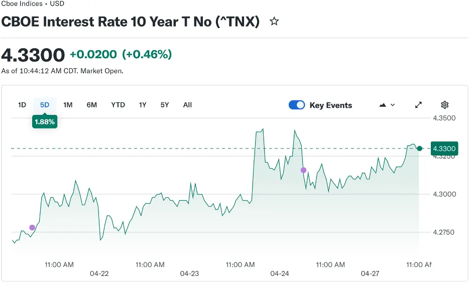 上周美国10年期国债整体呈现周整体小幅上行,基本运行在4.25%至4.31%区间。