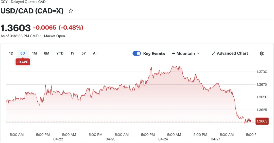 上周美元对加元汇率,整体呈现震荡上行走势,汇率由约1.36上升至1.37上方,周内升幅约0.5%–0.8%。美元走强主要受到美债收益率上行及利率维持高位预期支撑,而加元虽受油价维持在95–100美元区间的支撑,但未能完全抵消美元强势。整体来看,汇率走势反映出利差驱动仍占主导,加元表现相对偏弱。