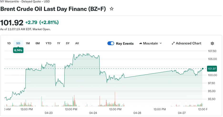 上周原油价格维持高位震荡并明显上行:Brent Crude Oil,约 100–105美元/桶。