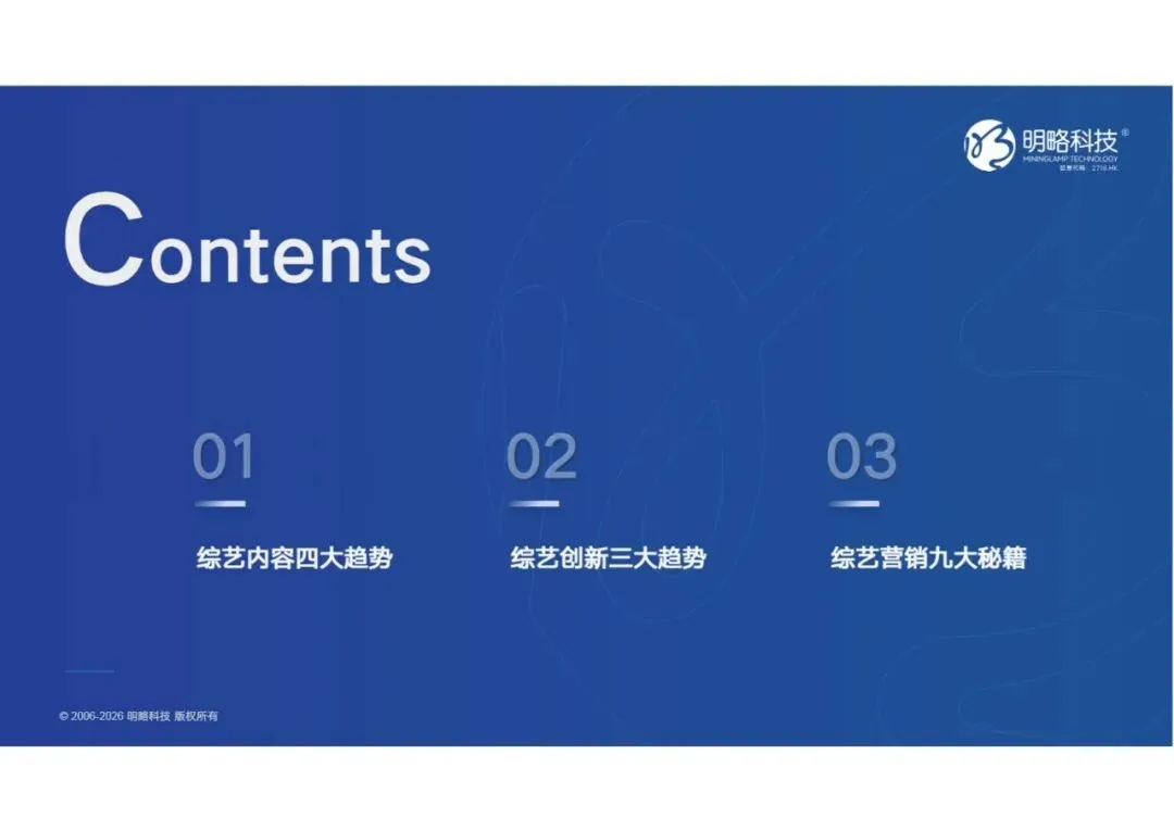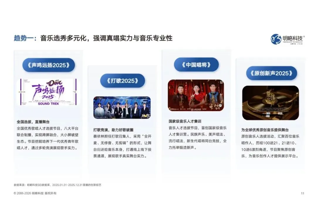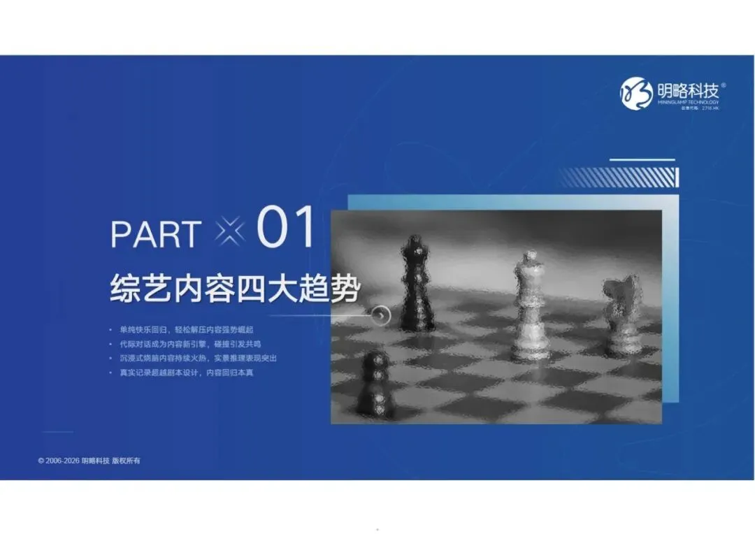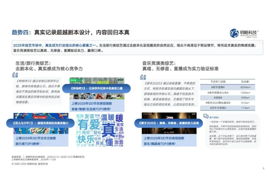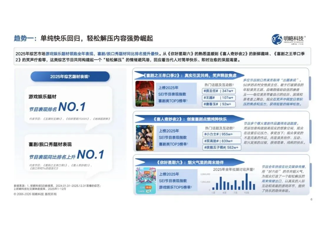 2025年中国综艺市场呈现出鲜明的内容迭代与价值转向,节目创作与受众偏好深度绑定,形成四大核心内容趋势:轻松解压类内容强势回归,代际对话成为情感共鸣新引擎,沉浸式实景推理题材持续领跑,真实记录式表达超越剧本设计成为主流。同时,音乐选秀、美食竞技、恋爱交友三大赛道持续创新,推动综艺形态向专业化、文化化、多元化升级。本报告依托明略科技 SEI 赞助评估指数与社交媒体数据,覆盖芒果 TV、腾讯视频、爱奇艺、优酷四大平台综艺样本,系统梳理 2024 至 2025 年综艺市场的内容特征、创新方向与传播规律,为行业把握市场动态、优化内容创作提供客观参考与数据支撑。