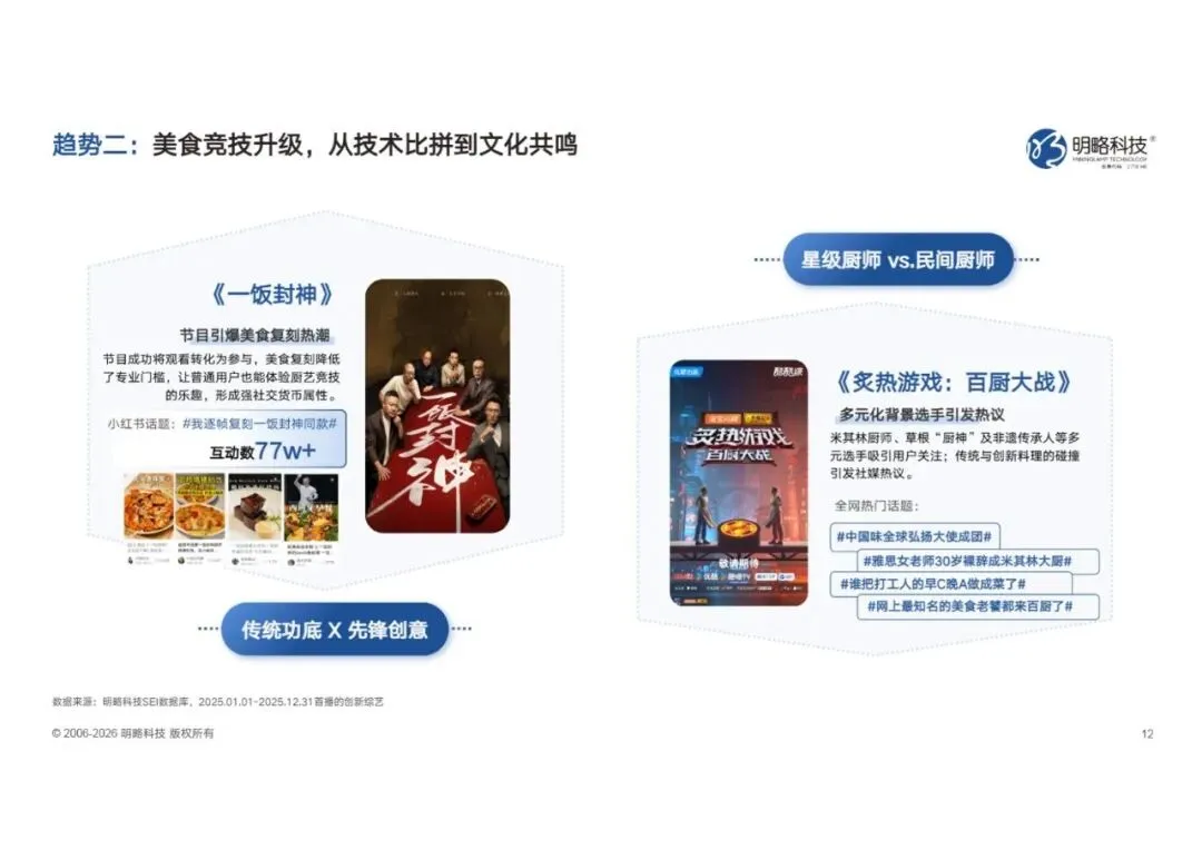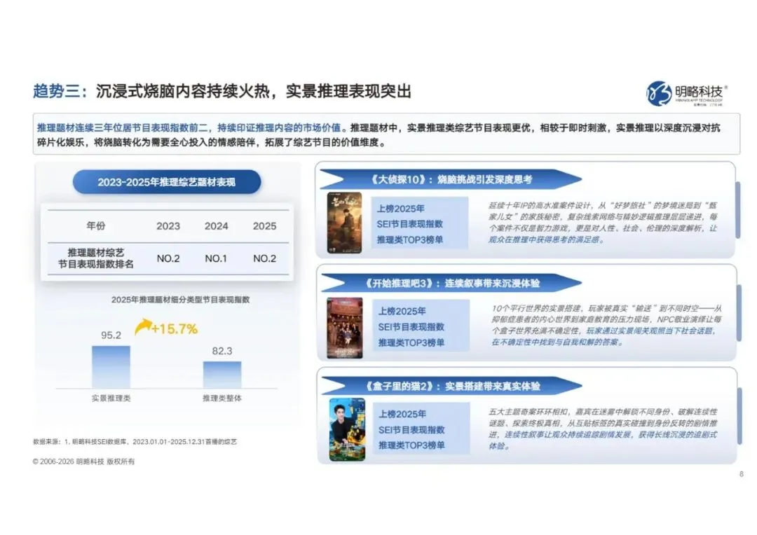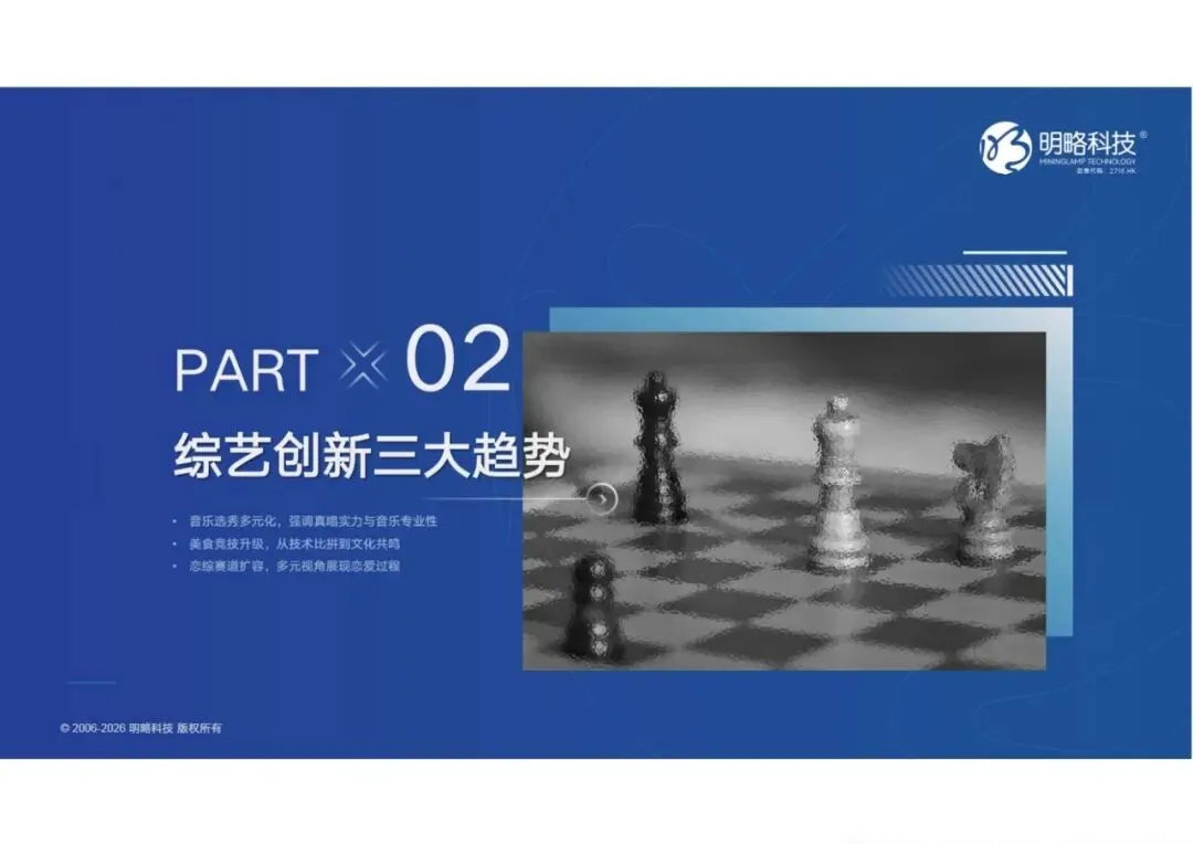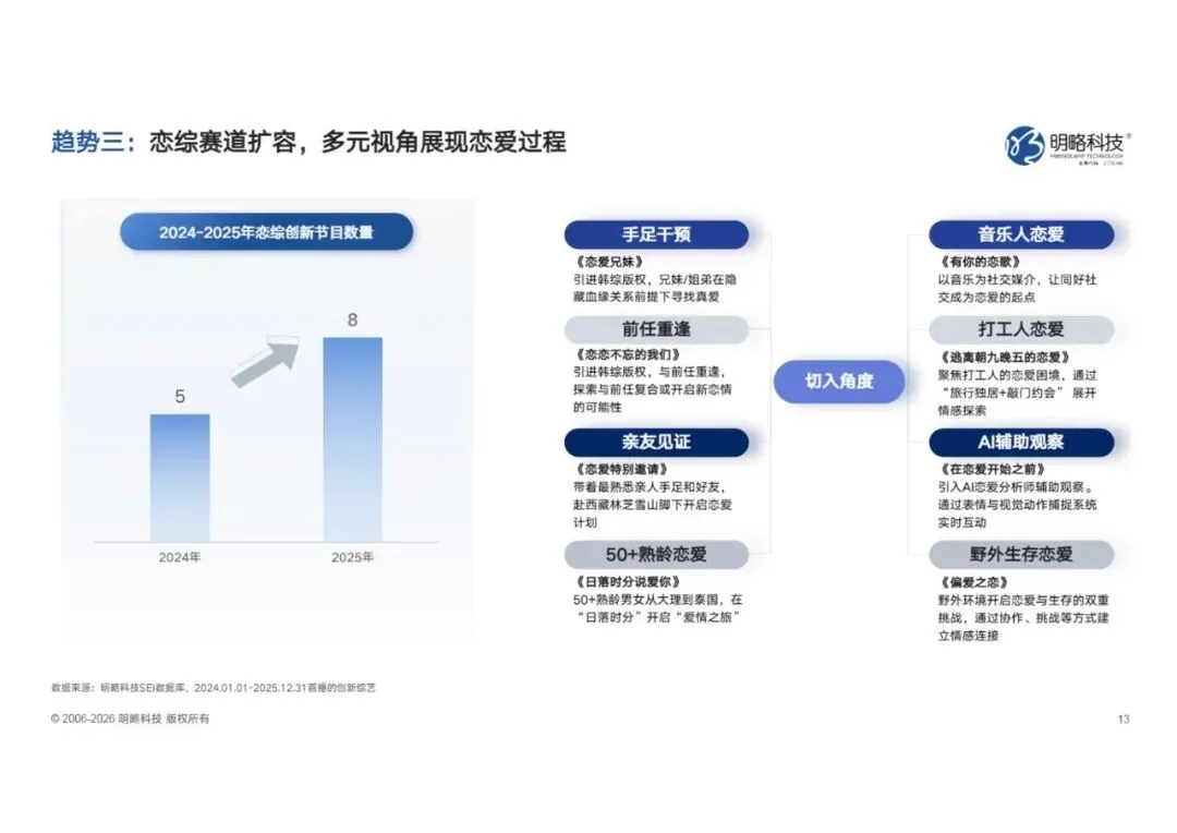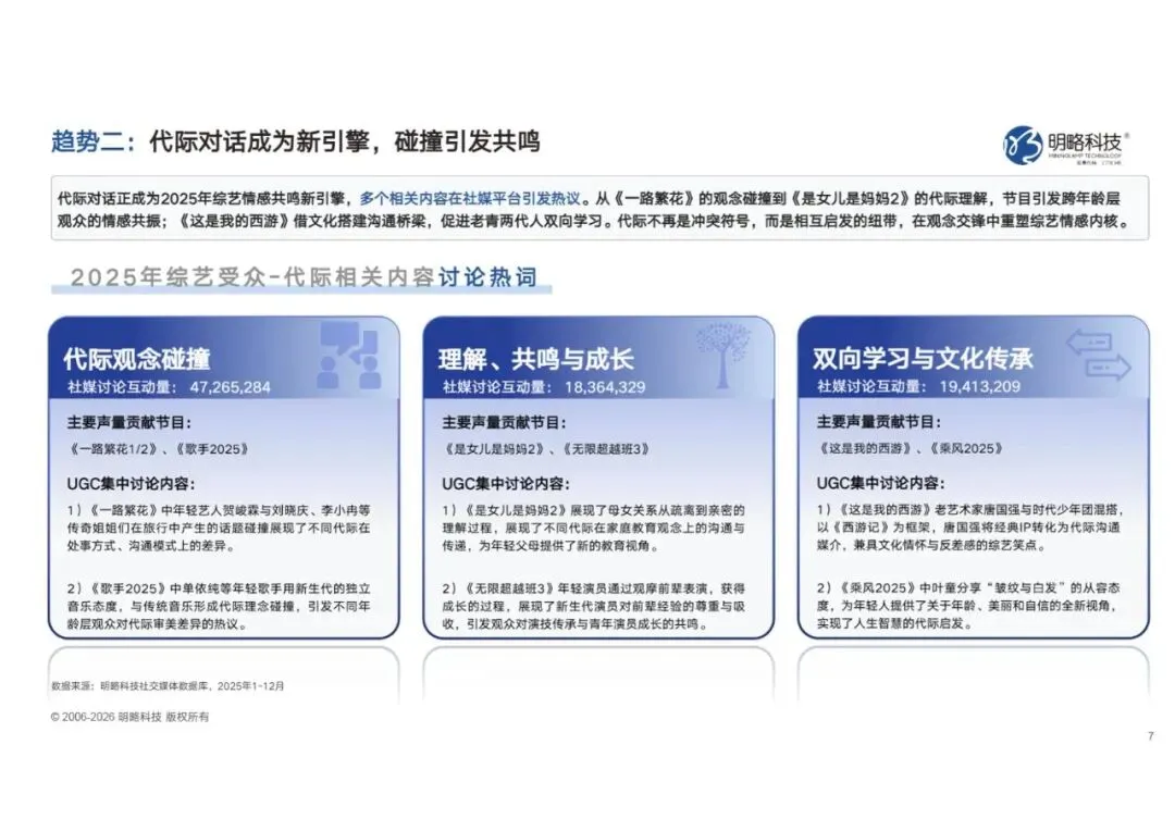2025年中国综艺市场呈现出鲜明的内容迭代与价值转向,节目创作与受众偏好深度绑定,形成四大核心内容趋势:轻松解压类内容强势回归,代际对话成为情感共鸣新引擎,沉浸式实景推理题材持续领跑,真实记录式表达超越剧本设计成为主流。同时,音乐选秀、美食竞技、恋爱交友三大赛道持续创新,推动综艺形态向专业化、文化化、多元化升级。本报告依托明略科技 SEI 赞助评估指数与社交媒体数据,覆盖芒果 TV、腾讯视频、爱奇艺、优酷四大平台综艺样本,系统梳理 2024 至 2025 年综艺市场的内容特征、创新方向与传播规律,为行业把握市场动态、优化内容创作提供客观参考与数据支撑。