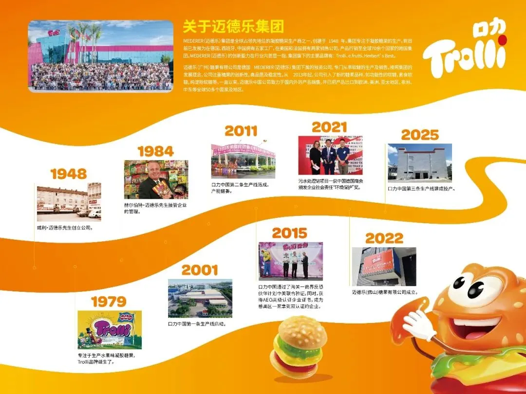 作为全球领先的凝胶糖果生产商,迈德乐集团自1948年创立以来,稳步拓展全球版图,如今已在德国、西班牙、中国布局五家现代化生产工厂,在美国、法国和英国立专业销售公司,产品远销全球70余个国家和地区。
