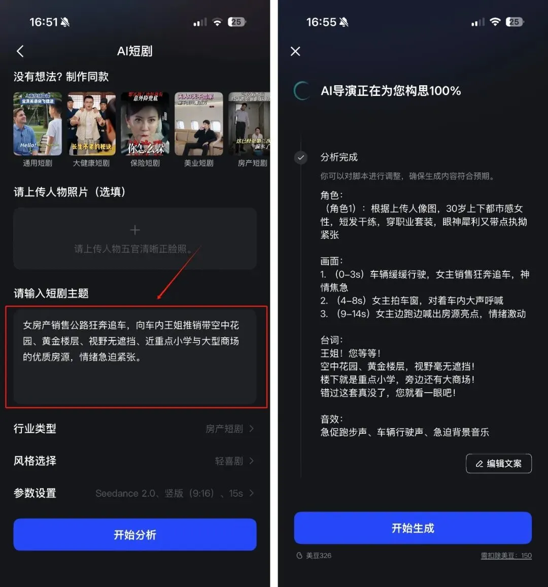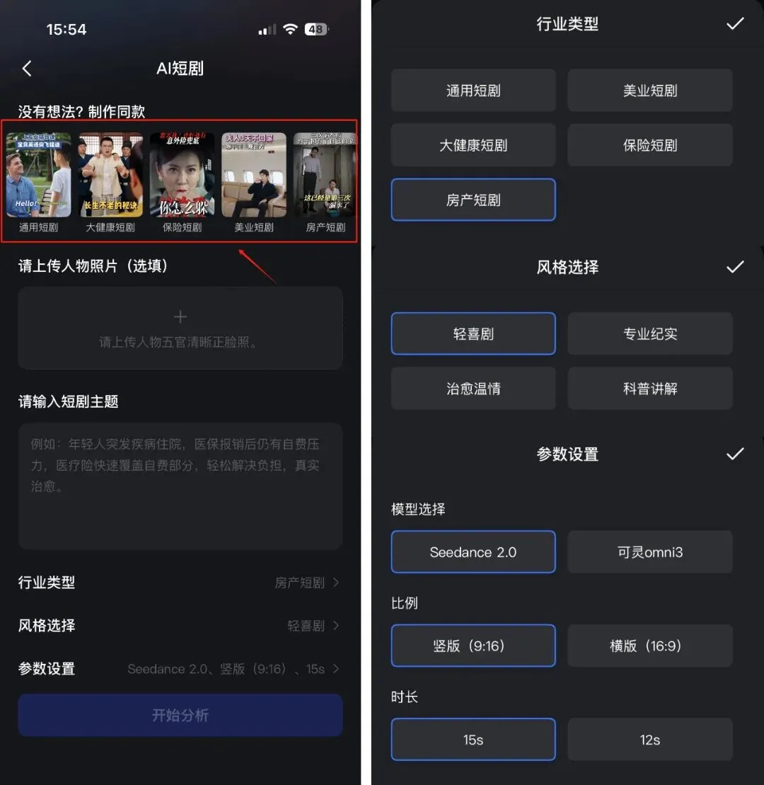 你只需要:选择【房产短剧】→输入你的短剧主题,然后依次选好行业类型、风格和模型参数