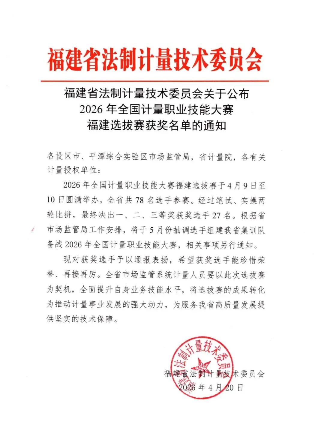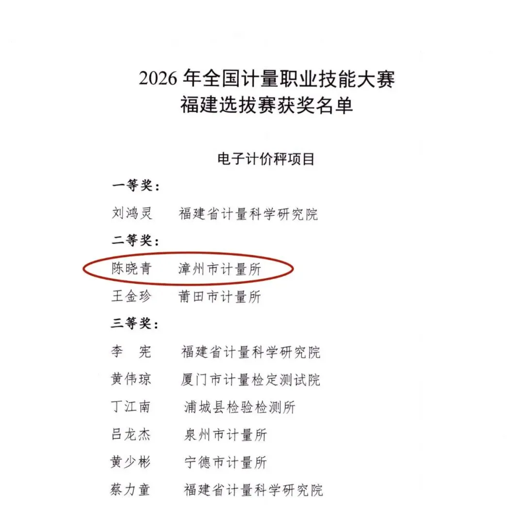 日前,2026年全国计量职业技能大赛福建选拔赛在福州圆满落幕。漳州市市场监管局选派的6名市计量所技术骨干在本次比赛中斩获佳绩。其中,陈晓青同志表现优异,荣获电子计价秤项目二等奖,成功入选省集训队,将代表我省参加全国大赛。