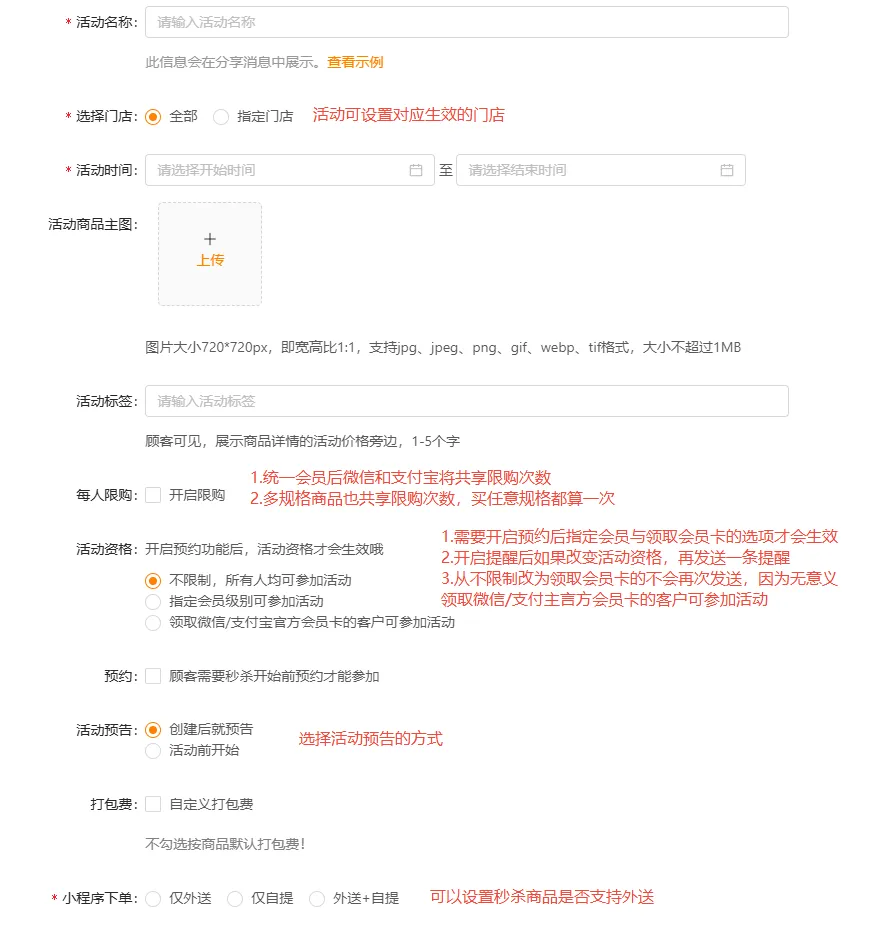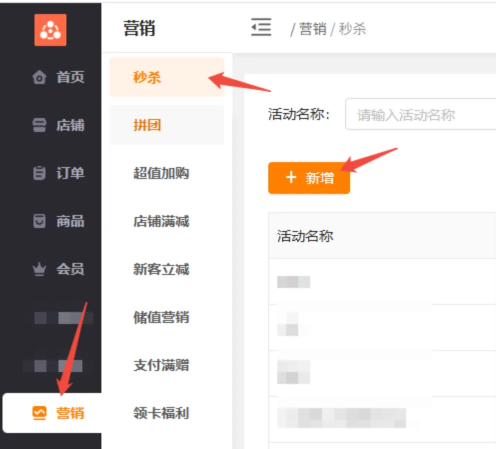 路径:商户后台 → 营销 → 活动 → 秒杀,点击“新增”,开始配置你的第一场秒杀活动。