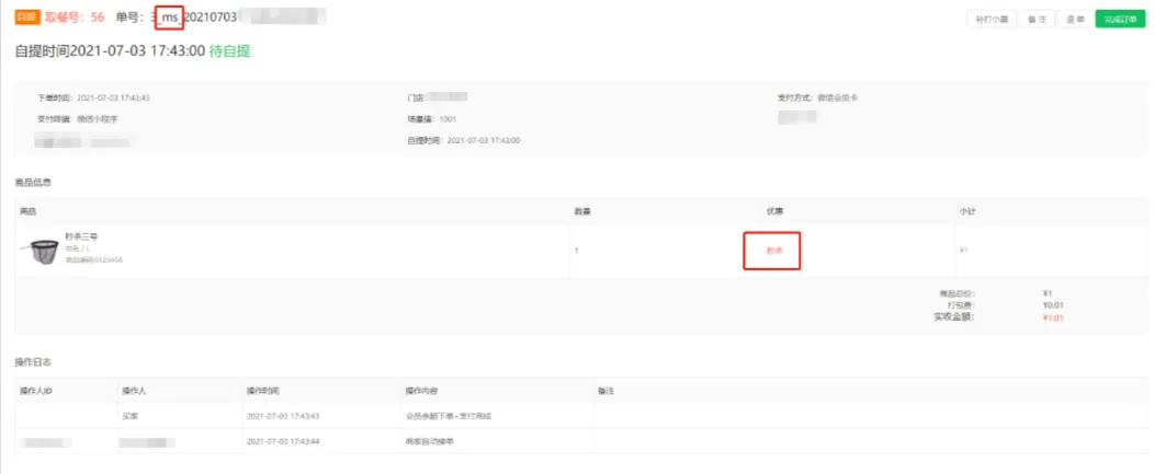 秒杀产生的订单,在订单列表中会有专属标识:订单号以 ms 开头(秒杀缩写)。商品行明确标注 “秒杀” 字样。与普通订单并列展示,方便统一管理,同时又能快速筛选区分。
