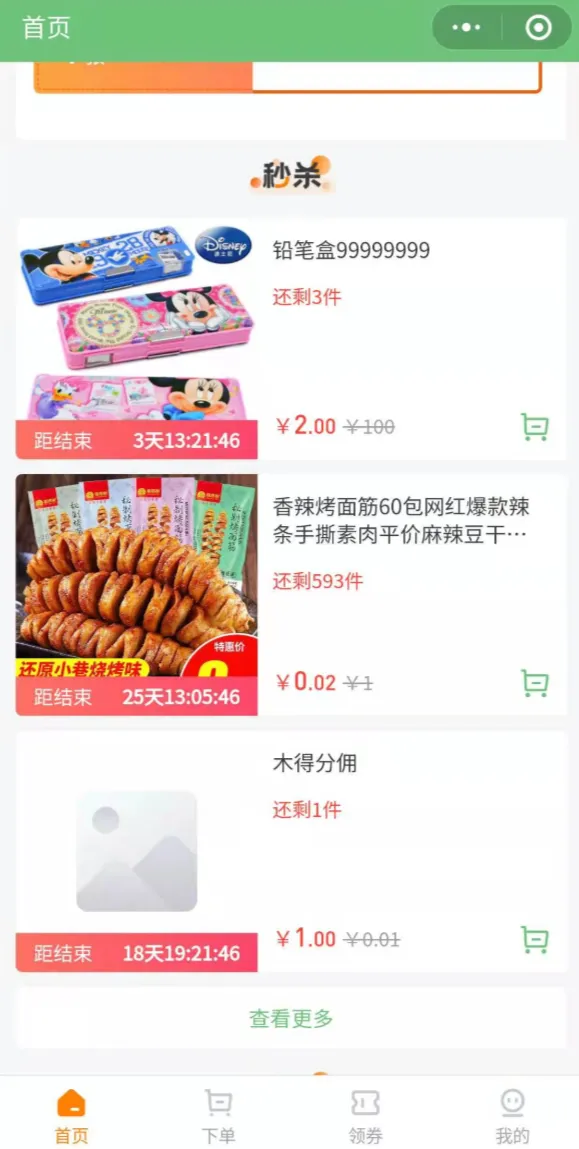 首页展示:根据预告时间自动展示秒杀活动列表。首页默认显示3个活动,超出后出现“查看更多”按钮。点击跳转完整秒杀页面,信息层级清晰。