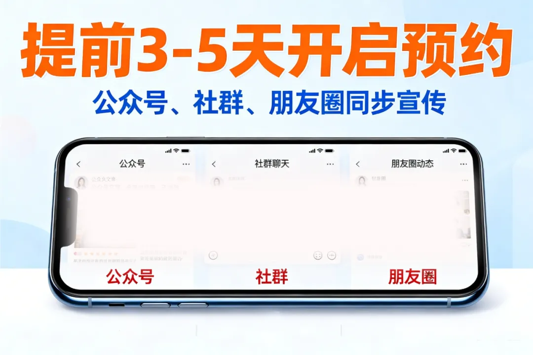 提前3-5天开启预约,公众号、社群、朋友圈同步宣传。预约人数越多,正式开抢时的转化越有保障。