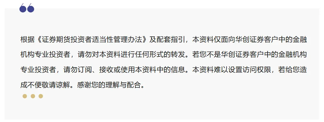 本资料来自华创证券研究所已经发布的研究报告,若对报告的摘编产生歧义,应以报告发布当日的完整内容为准。须注意的是,本资料仅代表报告发布当日的判断,相关的分析意见及推测可能会根据华创证券研究所后续发布的研究报告在不发出通知的情形下做出更改。华创证券的其他业务部门或附属机构可能独立做出与本资料的意见或建议不一致的投资决策。本资料所指的证券或金融工具的价格、价值及收入可涨可跌,以往的表现不应作为日后表现的显示及担保。本资料仅供订阅人参考之用,不是或不应被视为出售、购买或认购证券或其它金融工具的要约或要约邀请。订阅人不应单纯依靠本资料的信息而取代自身的独立判断,应自主作出投资决策并自行承担投资风险。华创证券不对使用本资料涉及的信息所产生的任何直接或间接损失或与此有关的其他损失承担任何责任。