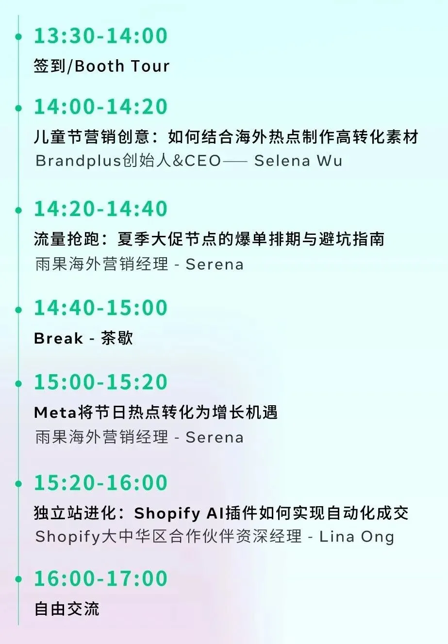 本次活动为闭门式精品沙龙,对准备拓展DTC业务、想做品牌出海的跨境卖家开放。现场配备Meta官方专家、Shopify资深合作伙伴、出海营销实战操盘手,为你打通“内容+投流+自动化”的增效路径。