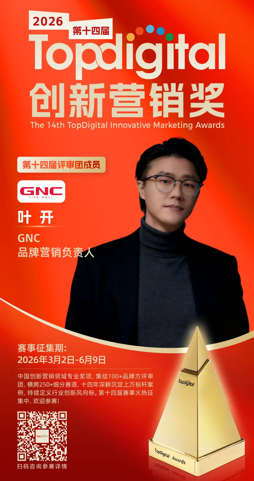 此次,我们非常荣幸邀请到GNC品牌营销负责人叶开加入专家评审团,与我们共同见证六大类别年度创新标杆的诞生——从营销案例、创意作品到技术产品、机构与人物,每一项都代表着2026年营销创新的实战高度。